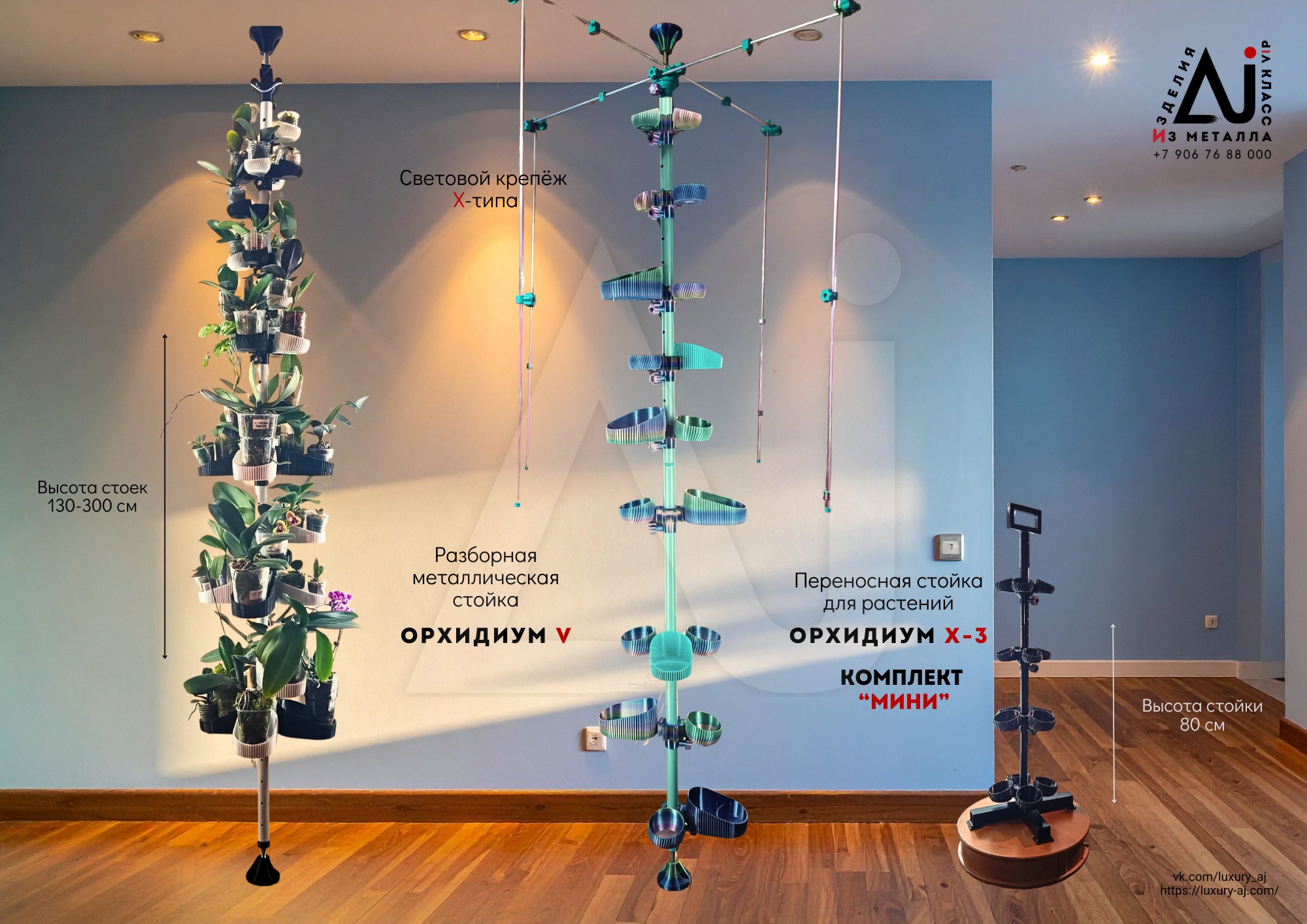 Металлическая стойка «Орхидиум V-3» - стойка для цветов может служить как подставка для цветов на подоконник, так и подставка для цветов напольная. В данный подарочный набор на Новый Год уже включены различные кашпо для орхидей, поддон для цветов и корзина для цветов.